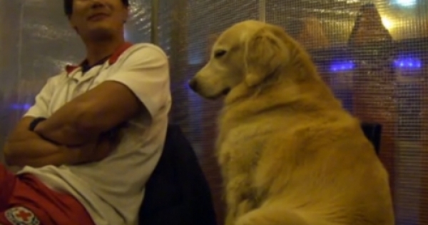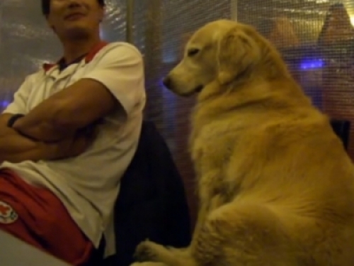 主人坐到狗狗身旁,可狗狗還是沒什麼反應。主人一是想嚇嚇狗狗,對著狗狗就大喊幾聲,可狗狗還是沒反應。主人不知道的是狗狗已經習慣了這嘈雜的環境,對它 喊沒什麼用的。