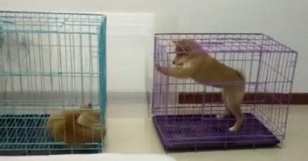 起先兩個籠子還有一段距離的,但是聰明的柴犬為了玩到同伴的尾巴,使出了渾身力氣,終於只有一步之遙了