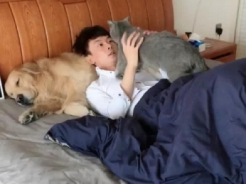 只見男友把家裡的金毛當成了枕頭,還靠了上面,而這隻大金毛似乎也非常樂意服務主人,更是愜意到睡著···此外呢,男友的手裡還抱著一隻貓玩弄,嘴裡還說著一些莫名其妙的話,就像一個正哄著孩子的父親!