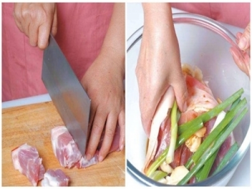 豬肉的部份就需要切塊,但是豬肉軟軟不好切,這時就有兩個妙招教你,一是先略為冰凍30分鐘 (但不是冰得硬梆梆喔),或是直接大塊肉先汆燙一下,這樣都可以讓肉定型,不會再搖搖晃晃,切起來不但美觀又工整喔!