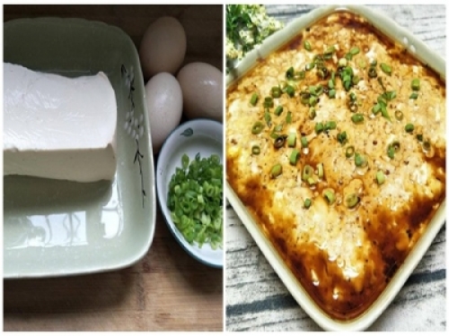 水豆腐1塊、雞蛋3個、鹽適量、香油幾滴、醬油半勺、蔥花少量。