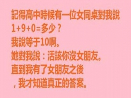 女同桌對我說 1+9+0=!我說等於10,她生氣說活該沒女朋友, 直到我有了女朋友之後才知道真正的答案不單純!