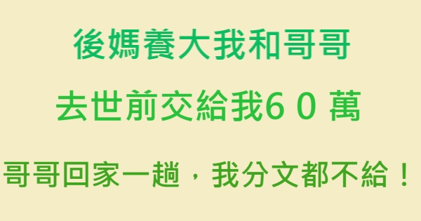 後媽養大我和哥哥,去世前交給我60萬,哥哥回家一趟,我分文都不給!