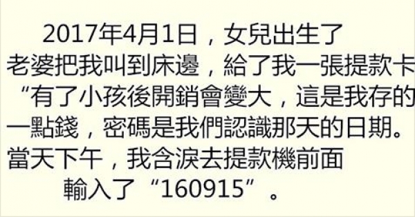 017年4月1日,女兒出生了老婆把我叫到床邊,給了我一張提款卡「有了小孩後開銷會變大,這是我存的一點錢,密碼是我們認識那天的日期。」當天下午,我含淚去提款機前面輸入了「160915」。