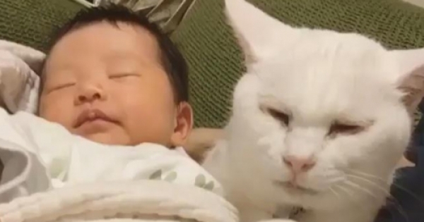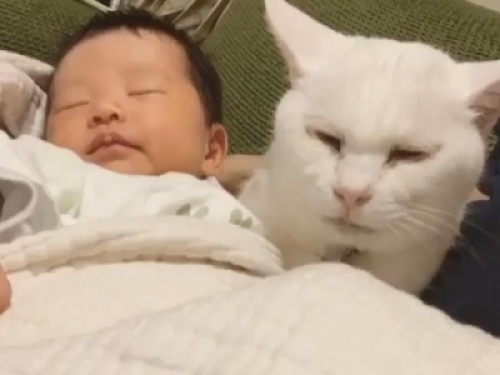 主人擔心喵主子不喜歡小寶寶,特別將他們兩個放在一起,結果下一秒發生的事情超暖心!