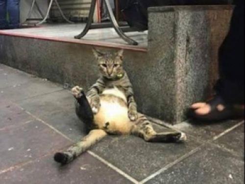 網友下班準備跟同事去吃飯的時候,來到一家餐廳時,被他們門口的服務生給吸引了,因為它不是人,而是一隻貓,做著撩人的姿勢,最重要的是這貓還把自己的私處露了出來,這貓真是為了多展覽客人,也是不顧一切了。