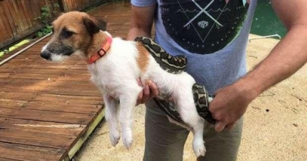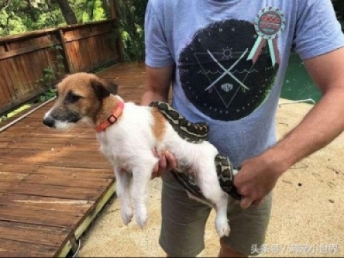 主人看愛犬被蟒蛇纏住,怎樣解都解不開,靈機一動把牠丟近.....馬上救出他的愛犬~