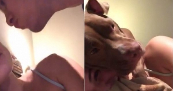 男友準備跟女友來個深情一吻,結果比特犬突然碰出來緊貼著媽媽~~汪:媽媽是我的!不要跟我搶!
