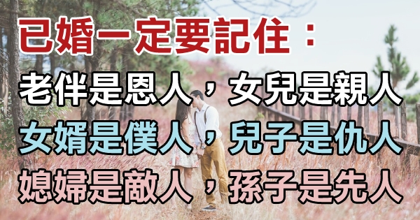已婚的一定要記住:老伴是恩人,女兒是親人,女婿是僕人,兒子是仇人,媳婦是敵人,孫子是先人!