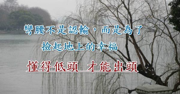 肯低頭,就永遠不會撞門;肯讓步,就永遠不會退步;求缺的人,才有滿足感。如果總是昂著頭,不會看見自己的缺點,適時的低頭想想,反省一下自己,發現不足,才能完善自己。