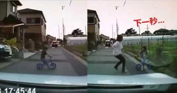 影片中一輛車行駛在小路上,一個騎著腳踏車的小男孩突然衝出來,嚇得駕駛緊急剎車。
