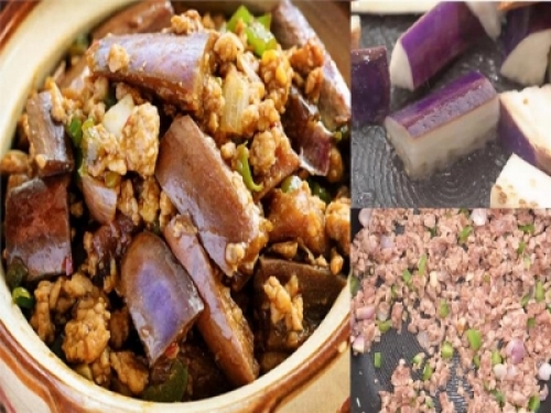材料:茄子1條、豬肉餡100克、蒜蓉1茶匙、幹蔥1茶匙、青椒1個、鹹魚粒1湯匙、生抽1湯匙、清水1/2湯匙、砂糖1/2茶匙、粟粉1 /2茶匙、魚香茄子醬1茶匙、老抽1茶匙、砂糖1/2茶匙、水4湯匙。