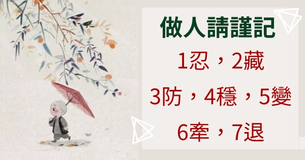 做人請謹記:1忍,2藏,3防,4穩,5變,6牽,7退