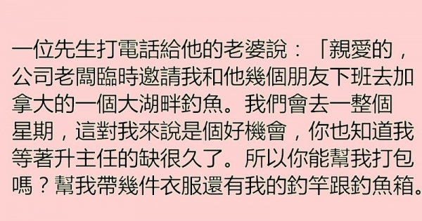 一位先生打電話給他的老婆說:「親愛的,公司老闆臨時邀請我和他幾個朋友下班去加拿大的一個大湖畔釣魚。我們會去一整個星期,這對我來說是個好機會,你也知道我等著升主任的缺很久了。所以你能幫我打包嗎?幫我帶幾件衣服還有我的釣竿跟釣魚箱。我們等會下班會直接從辦公室出發,我會路過門口拿我的行李。那個..你可以順便幫我把那件新的藍色絲綢內褲和睡袍帶上嗎?」