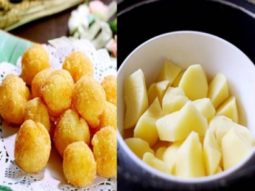 壓好的土豆泥,用手先搓一個小圓球再用手直接壓成小餅狀,放入切好的芝士丁。再用土豆泥把芝士包裹起來,形成一個個小圓球