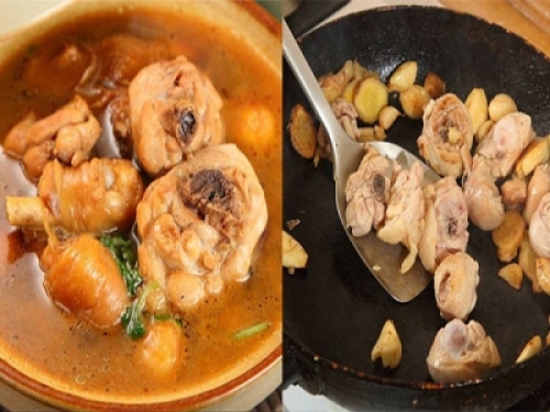 Step4: 放入雞腿略炒一下,加入油膏、醬油、糖、鹽、米酒等拌勻,起鍋置入砂鍋內。