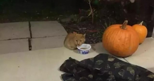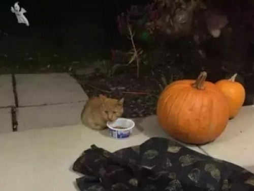 10月底的時候,幾乎家家都在忙著過萬聖節。某天晚上,這只後來被起名為Buster的貓咪來到了紐約一家人家的門廊上。這家的女主人發現了它,用小碗給它盛了貓糧,就在南瓜旁邊款待了它。