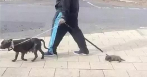 小奶狗還很小,根本就跟不上主人的腳步。可是這位主人卻不管不顧,也不想抱它,就這樣一直拖著它!