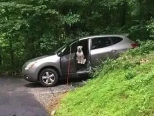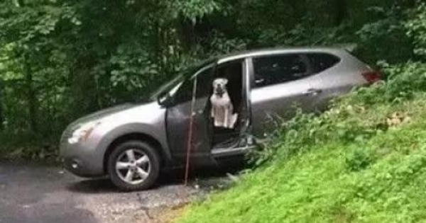 這位鏟屎官的車子停靠在路邊,上個廁所回來,發現一隻狗居然坐在車上等它...