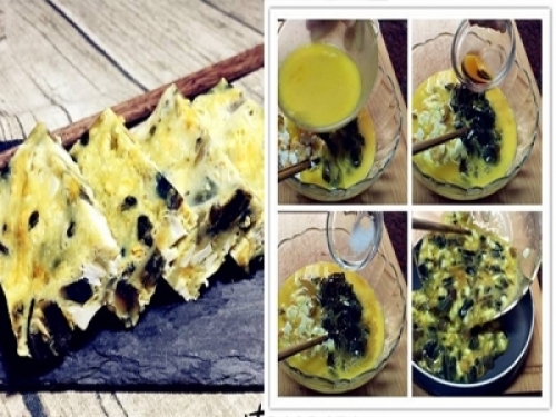 【食材處理】:鹹蛋和皮蛋剁碎備用。雞蛋打發。