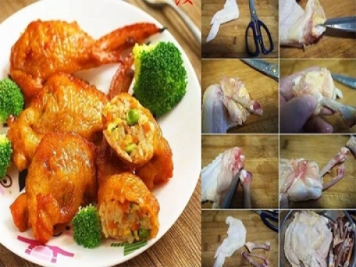 15,將炒好的米飯用小勺塞入雞翅內,注意塞緊實;