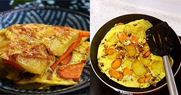 【蔬菜烘蛋】材料:雞蛋3枚、洋蔥半個、胡蘿蔔1個、土豆1個、油鹽適量。