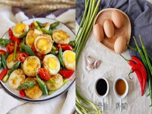 1.將雞蛋煮熟,涼水裡放涼後拿出剝殼切片。青紅椒切圈,蒜苗切斷。