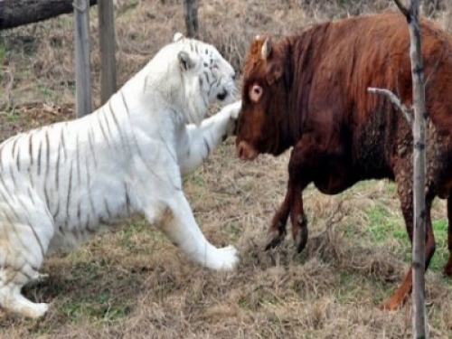 近日,某公園為了給圈養的老虎鍛煉其捕獵的能力,竟然趕進去了一頭黃牛,但是當家養黃牛和圈養老虎發生碰面,卻發生了這樣一件事。