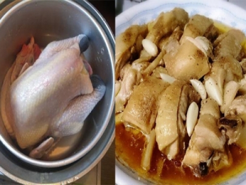 烹煮完成的蒜頭雞成品,外觀很像白斬雞,但是味道真的好吃到難以形容!