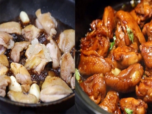 3雞塊變得金黃色時,加入米酒、老抽、生抽和黃冰糖調味,不需要