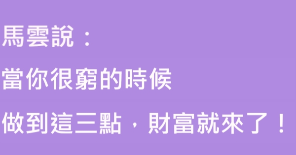 看完後是不是覺得Choco小編在有錢人這麼想分享的勵志故事文章讓人深思呢?想看更多好文,或是喜歡有錢人這麼想的文章的話,可以按讚追蹤勵志文章一級捧並分享這篇「馬雲:當你很窮的時候,做到這三點,財富就來了!」出去給大家一起看看!