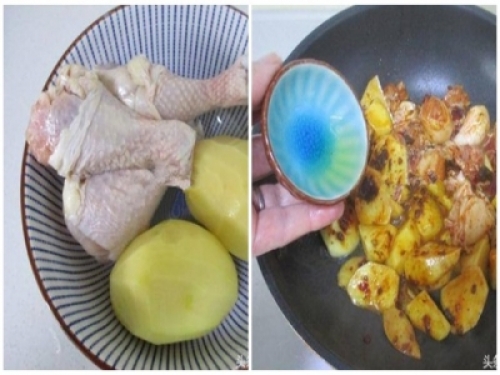 6.倒入入雞和馬鈴薯翻炒均勻