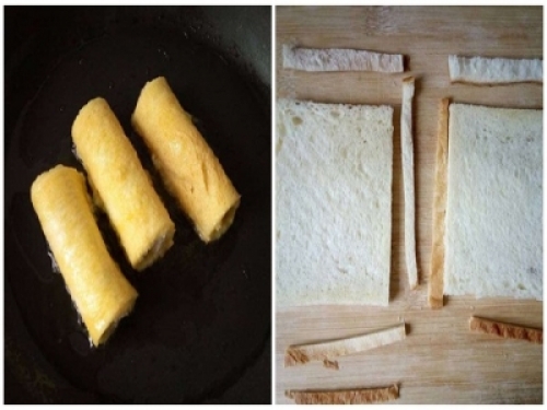 吐司片,就是方的麵包片,超市或烘焙店直接有賣,一般8塊到10塊可以買一大袋,一袋有10片左右,很便宜,像我一樣,卷點自己喜歡吃的餡料,裹上蛋液,煎一下,很快就好,一分鐘都不用吧,火力不要太大,別煎糊了。好香,好好吃啊!