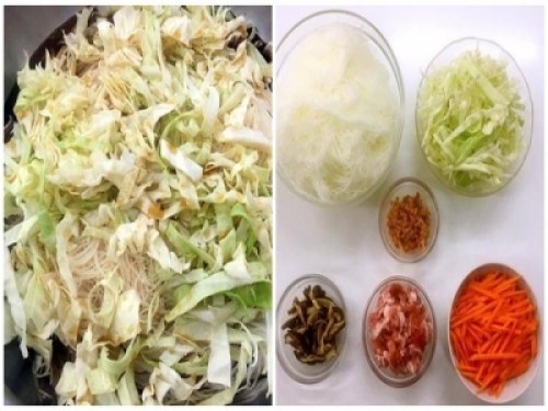 1.將米粉泡軟30分鐘後對半剪;捲心菜洗凈切絲;蝦米以米酒略泡去腥;紅蘿蔔去皮切絲;干香菇泡軟切絲;肉絲以腌料抓勻腌20分鐘備用。