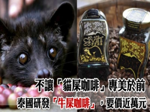 而不讓印尼的麝香貓咖啡專美於前,日前在泰國則研發出一款「牛屎咖啡」,據稱口感酸苦但不澀,酸味消失後能化成甜味,風味極佳,現在每公斤售價為1萬泰銖,相當台幣9716元。