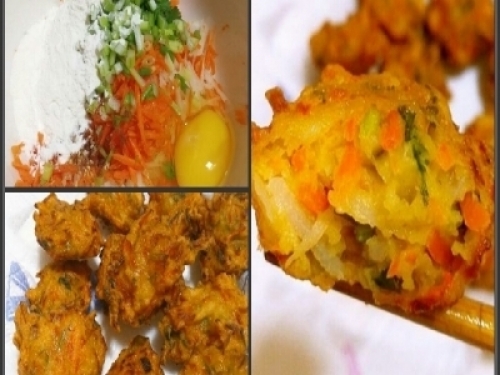 取一個大碗,胡蘿蔔、蓮藕擦絲,香菜、蔥切碎,打一個雞蛋,加麵粉適量,加鹽、雞精、一點五香粉和胡椒粉。