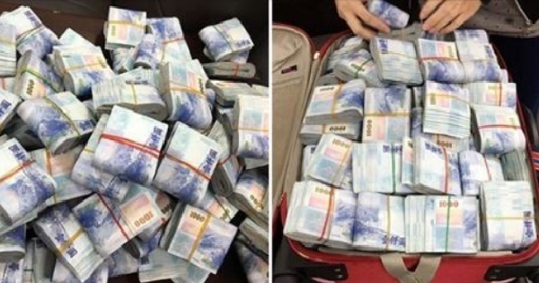 還曬出9疊1000元與2000元大鈔的「鈔票磚」。