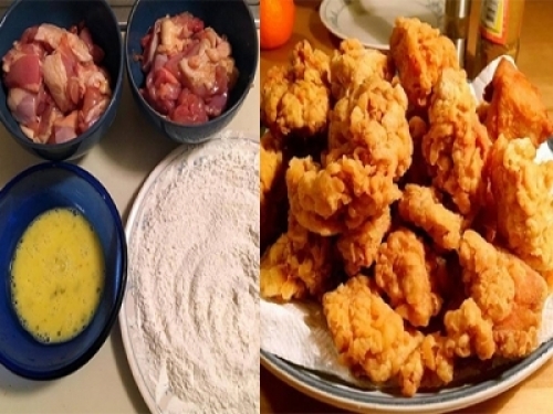 在切好塊的雞肉裡加入適量生抽,適量鹽,蒜末,薑末,少量糖,少量橄欖油,和少量黑胡椒,然後抓勻醃制半小時以上。準備蛋液,麵粉和澱粉