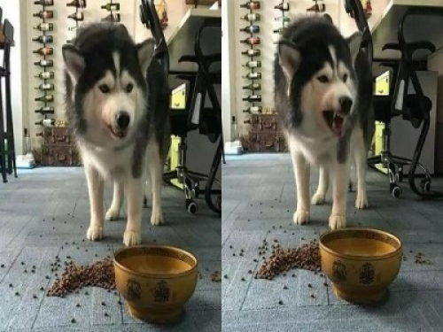 一鏟屎官最近發一組他家二哈兇他的照片。吃飯的時候他給二哈用碗準備了狗糧,但是走路的時候不小心踢翻了~