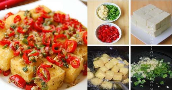 老豆腐 250克, 新鮮紅尖椒4個, 蔥、蒜末各1大勺,鹽、雞精、黑胡椒粉、花椒鹽各1/2小勺, 食用油適量