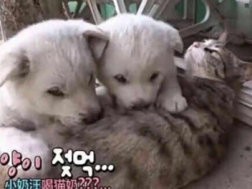 這兩隻狗狗估計是把母貓當成奶娘了~