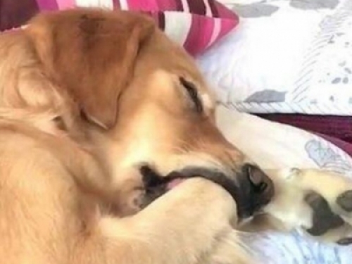 於是就舔啊舔, 其實都是在舔自己的爪子, 睡夢中的金毛犬以為是豬腳呢