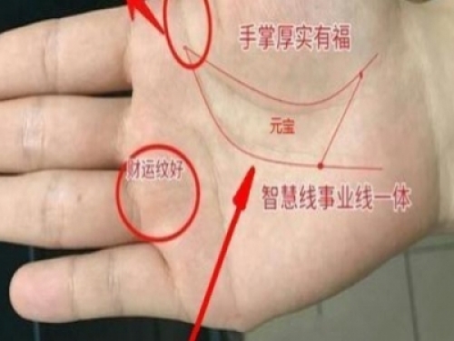 這位女福主的手相,很特別少見,手掌智慧線與事業錢是同一條手紋,且和生命線形成標準的"元寶紋"。擁有這種手紋的女孩,非常聰明,而且擁有超能力的智慧,一生中會有很強的智慧領導能力,如果好好發展成為某個領域的領袖人物,財運不錯,偏財很旺