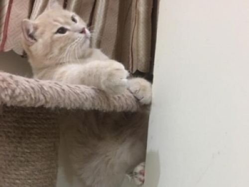 結果一開房門,發現這貓竟然自己玩貓爬架的時候,不小心腳底一滑,整隻貓就掛在了那裡,上不得,下不得,看著牠的樣子我不禁哈哈大笑,然後貓咪見我沒有第一時間救牠,立馬就對我賣了個萌,哈哈哈哈~