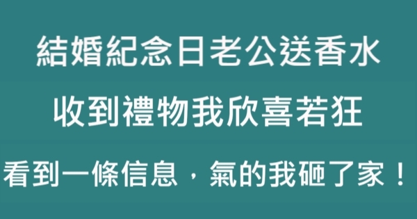 大家好,我是 Choco 今天來跟你說說 結婚紀念日老公送香水,我欣喜若狂,看到一條信息,氣的我砸了家!吧!讓我們來看看!