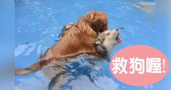 哈士奇終於受不了,想上岸逃命求鏟屎官救命呢,又被黃金拖下去了~
