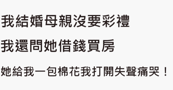 大家好,我是 Choco 今天來跟你說說 我結婚母親沒要彩禮,我還問她借錢買房,她給我一包棉花我打開失聲痛哭!吧!讓我們來看看!
