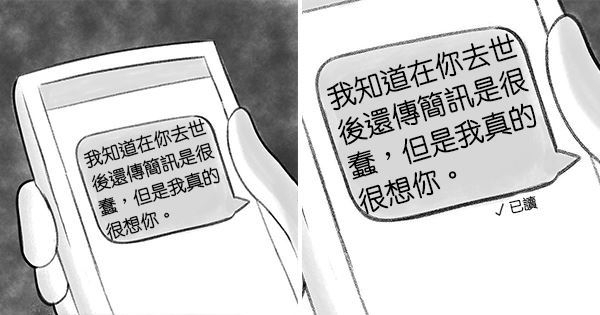 ▼「我知道在你死後傳簡訊給你是一件很愚蠢的事,可是我很想你。」