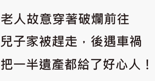 大家好,我是Choco 今天來跟你說說 老人「故意穿著破爛」前往兒子家被趕走,後遇車禍把「一半遺產」都給了好心人!吧!