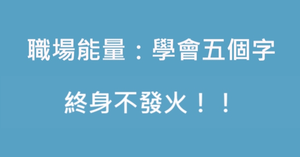 看完後是不是覺得CA小編在有錢人這麼想分享的職場能量文章很好呢?想看更多好文,或是喜歡有錢人這麼想的文章的話,可以按讚追蹤努力向上不會輸並分享這篇「職場能量:學會五個字,終身不發火!!!」出去給大家一起看看喔!